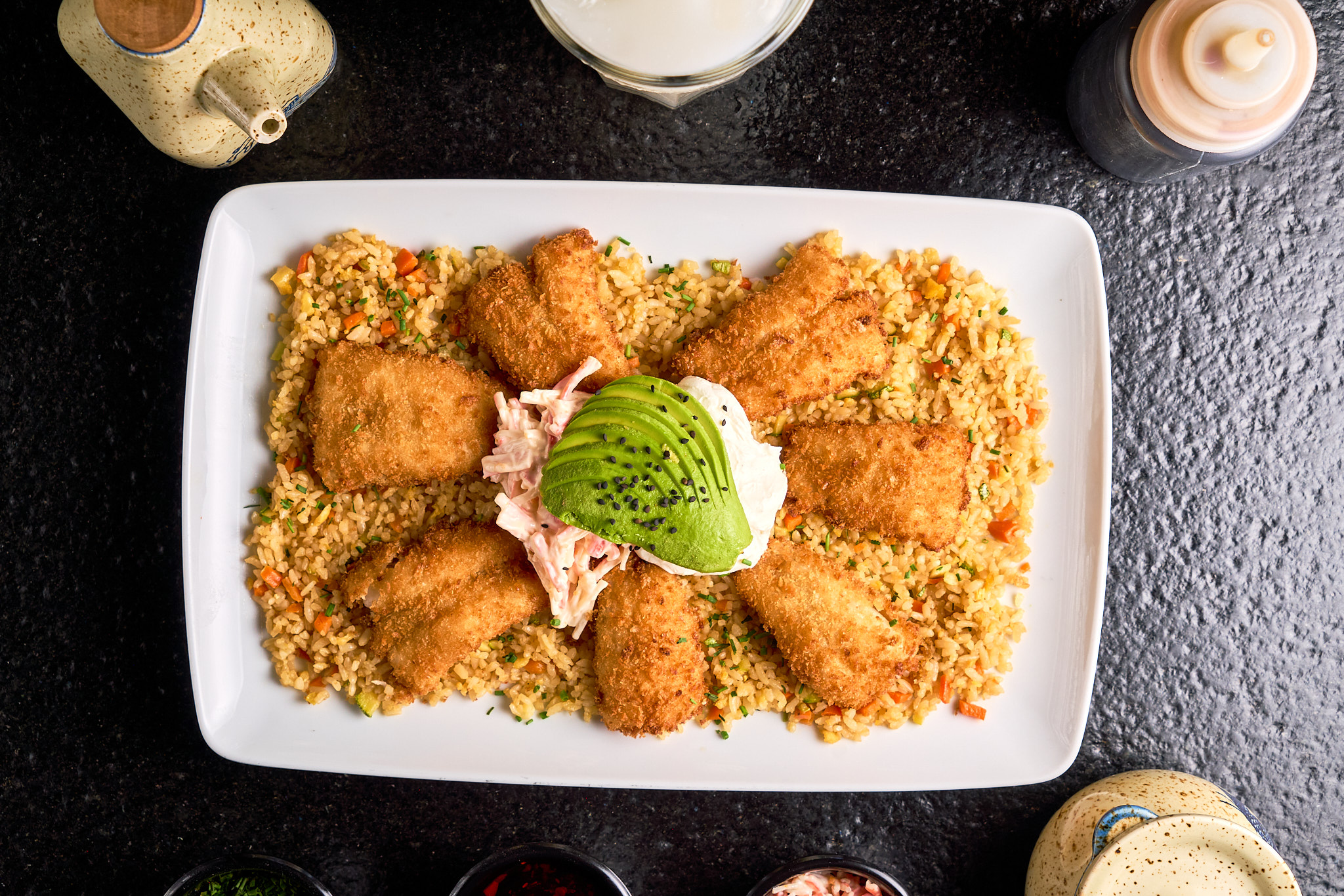 Camarones empanizados rellenos de queso philadelphia acompañados con aguacate, ensalada de cangrejo y arroz frito