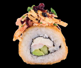 Topping: Ensalada de cangrejo, salsa de chipotle, cebollín, ajonjolí y salsa de anguila.