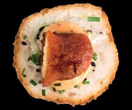 Topping: Ensalada de cangrejo, tocino, cebollín y ajonjolí