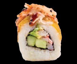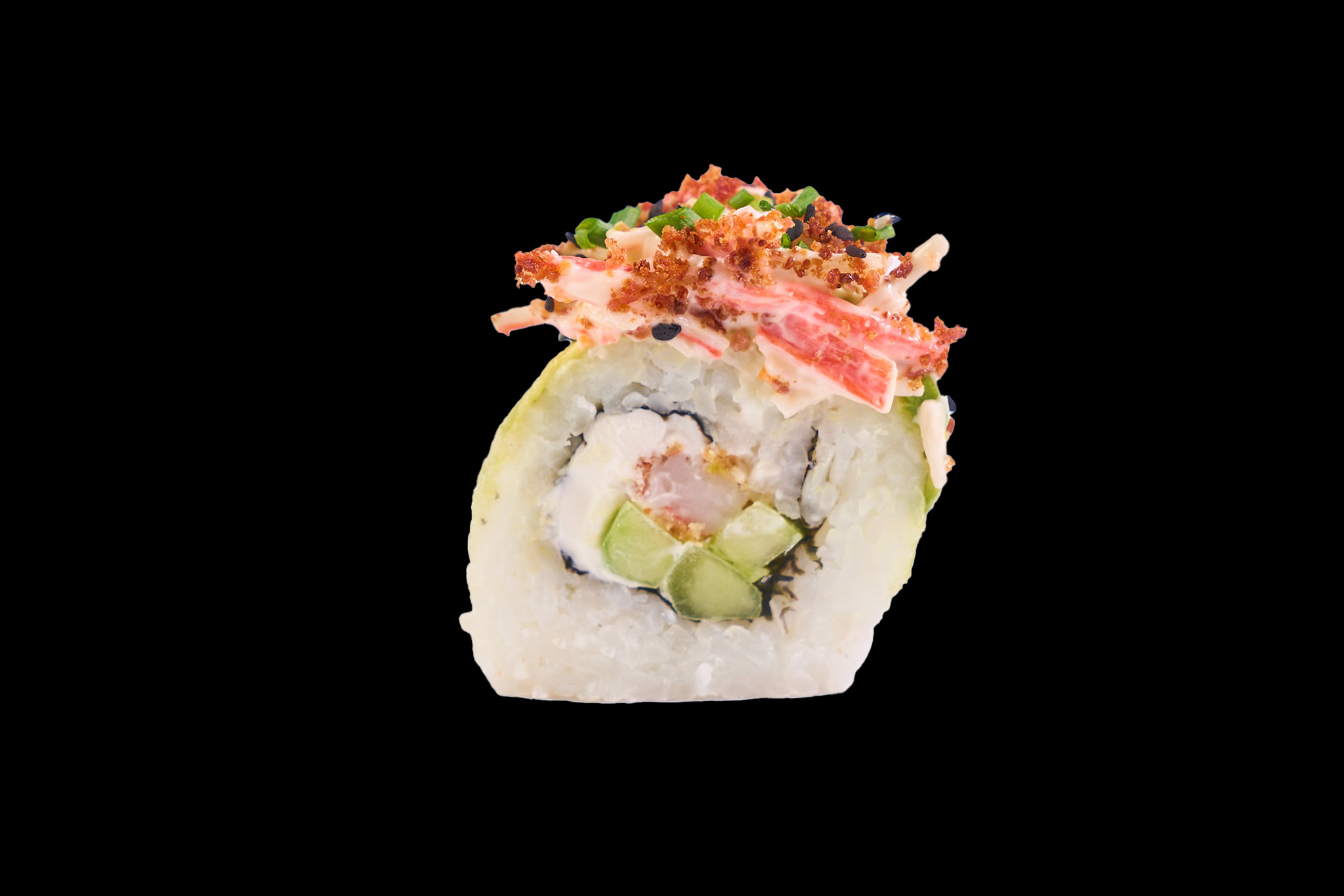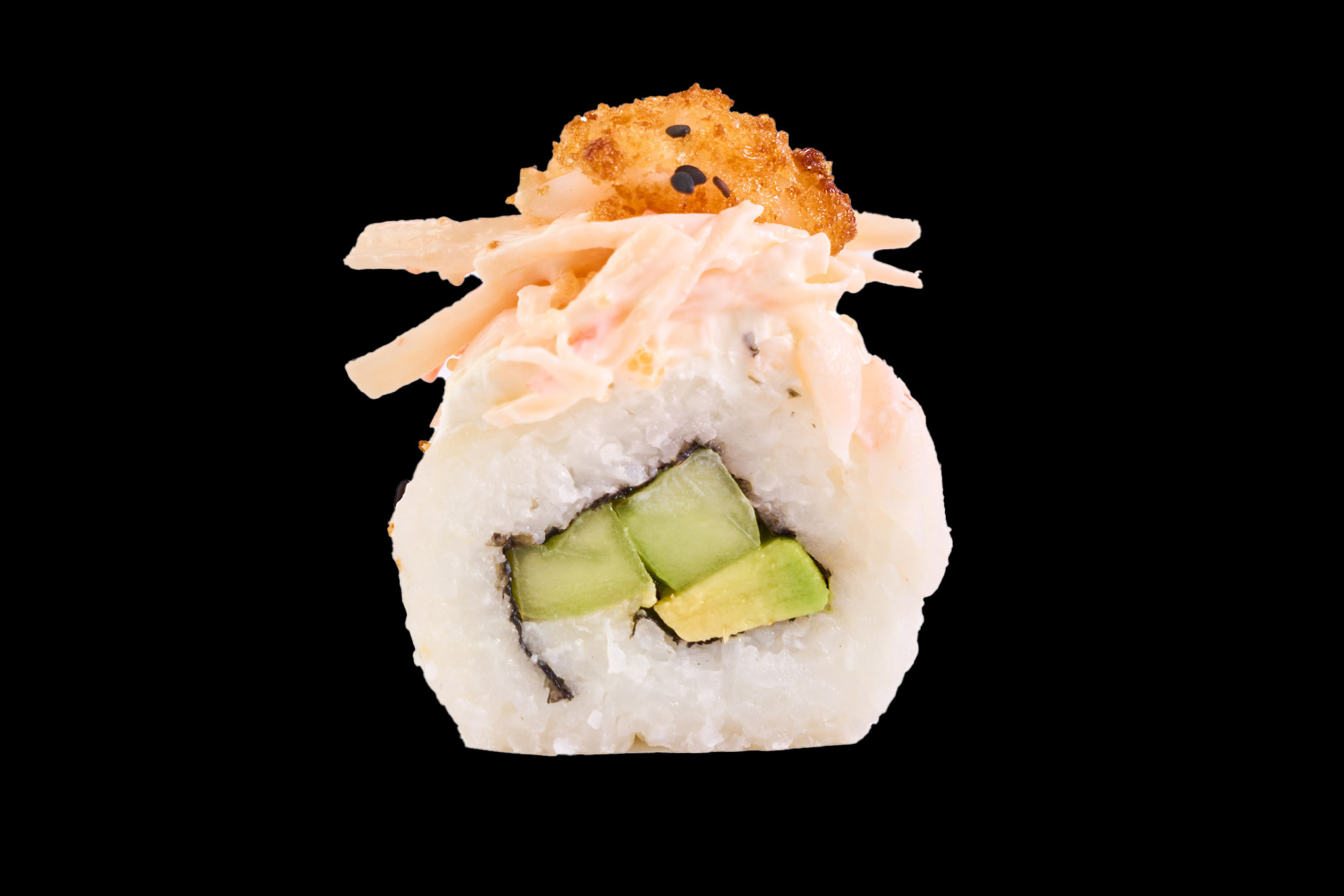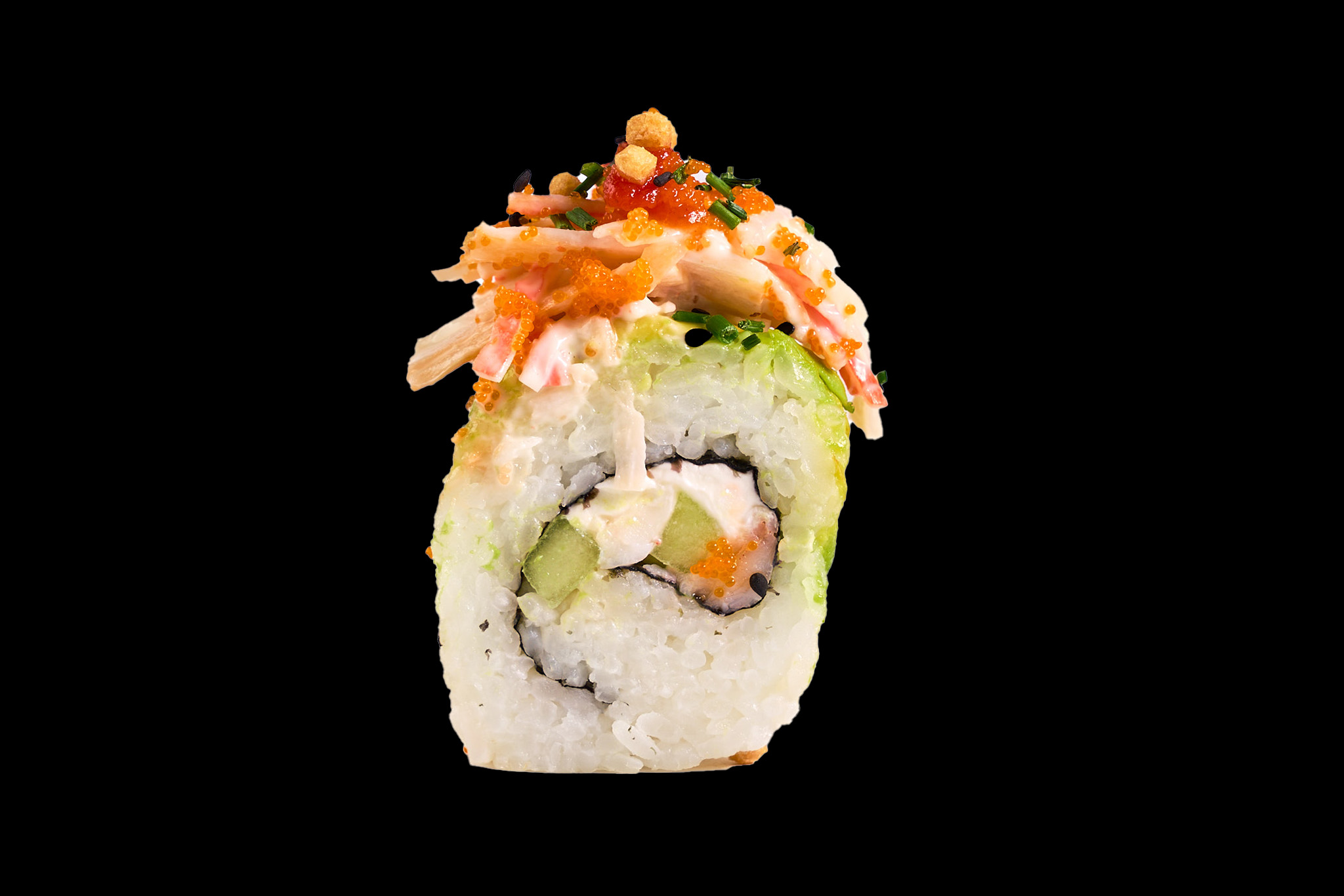 Topping: Ensalada de cangrejo, salsa de chipotle, cebollín, ajonjolí y salsa de anguila.