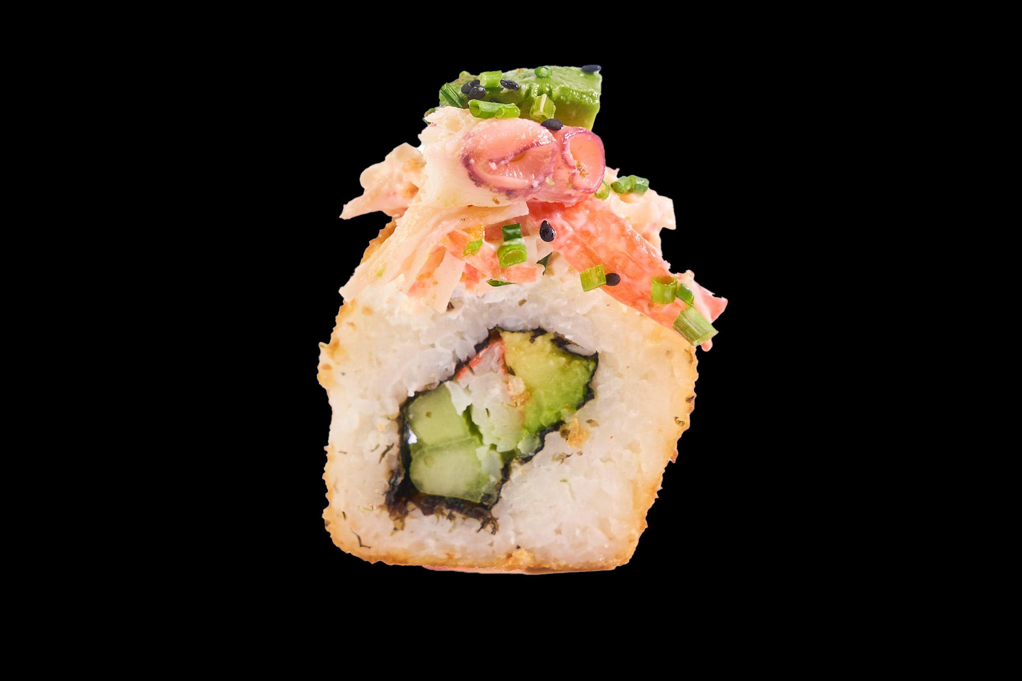 Topping: Ensalada de cangrejo, camarón empanizado y ajonjolí